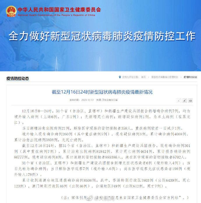 - 新增确诊病例:叁壹个省(自治区、直辖市)和新疆生产建设兵团报告新增确诊病例4例 ,均为境外输入病例,具体分布为山东贰例,上海壹例 ,广东壹例 。