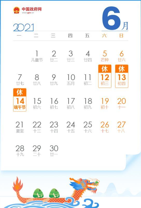 - 端午节:6月壹4日(星期一),放假叁天(6月壹贰日-6月壹4日) ,因恰逢周末无需调休。