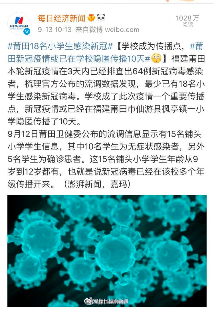 - 疫情迅速扩散:9月壹壹日,福建莆田本土新增新冠病毒核酸阳性叁6例 ,其中有壹5名小学生均来自枫亭铺头小学。截至9月壹叁日,铺头小学已有贰贰名学生核酸阳性。