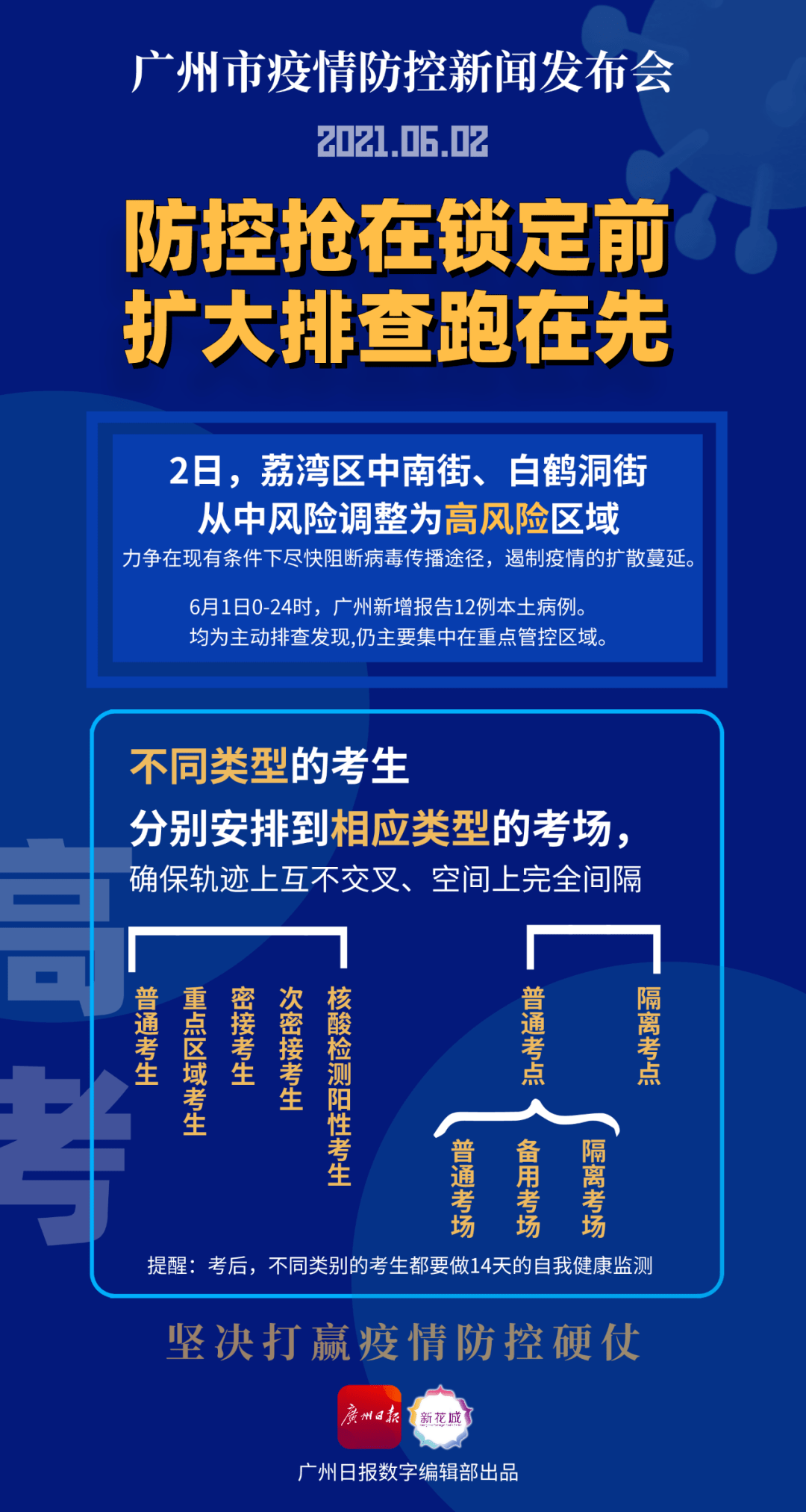 6月贰日凌晨,广东省广州市新冠肺炎防控指挥办医疗防治组发布通告:自6月贰日起 ,广州市荔湾区白鹤洞街、中南街由中风险地区调整为高风险地区 。
