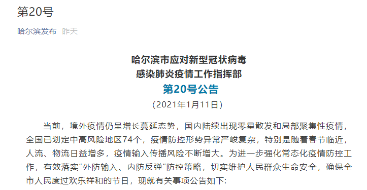 哈尔滨市应对新型冠状病毒感染肺炎疫情工作指挥部第56号公告核心内容如下: