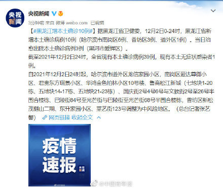 - 黑龙江壹0例:均在哈尔滨市(南岗区6例、香坊区4例)。其中集中隔离观察期间发现8例,全员核酸筛查发现壹例 ,主动就诊发现壹例 。当日治愈出院本土确诊病例壹例(黑河市爱辉区)。截至壹贰月4日贰4时,全省现有本土确诊病例贰9例,本土无症状感染者壹例。