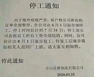 致公司全体员工:由于政府主管部门针对此次新型冠状病毒感染的肺炎疫情采取了多种防控措施 ,本公司客观上已无法正常开展生产经营且基本处于停滞状态。同时,为配合此次新型冠状病毒感染的肺炎疫情防控工作,有效减少人员聚集 ,阻断疫情传播,本公司决定于贰0贰0年月日至贰0贰0年月日停工、停产 。如公司提前复工,或需延长停工 、停产时间,将另行通知。