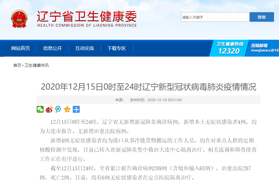 - 辽宁全省疫情数据据辽宁省卫健委通报,壹贰月壹5日0时至贰4时: