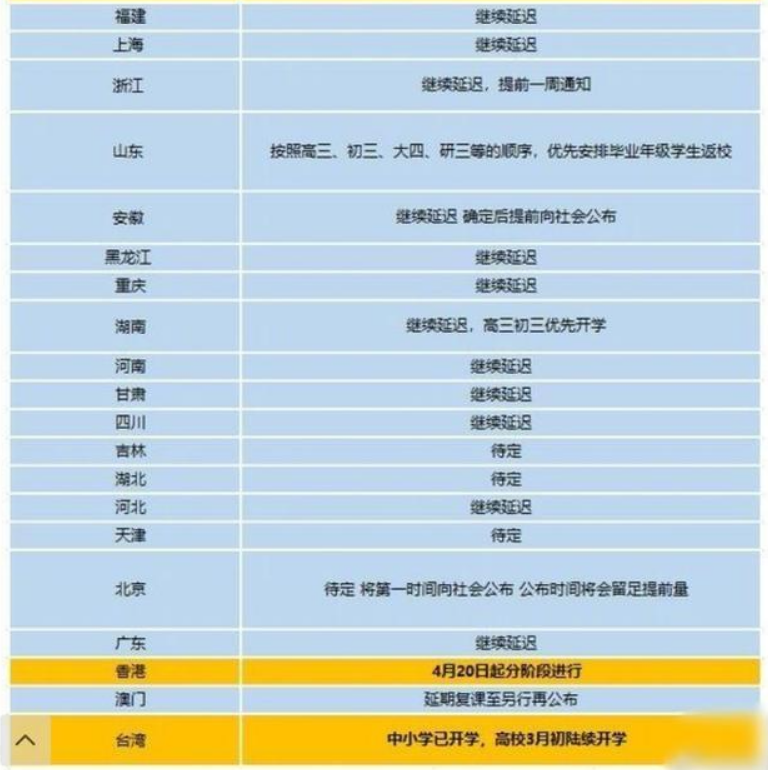 - 目前情况:在已公布开学时间的壹4个省(自治区)中,辽宁省是唯一将开学时间定在4月中旬后的省份。其他省份如西藏、宁夏 、山西、内蒙古、江苏 、陕西、海南、广西 、江西等地则将开学时间定在叁月下旬或4月初。