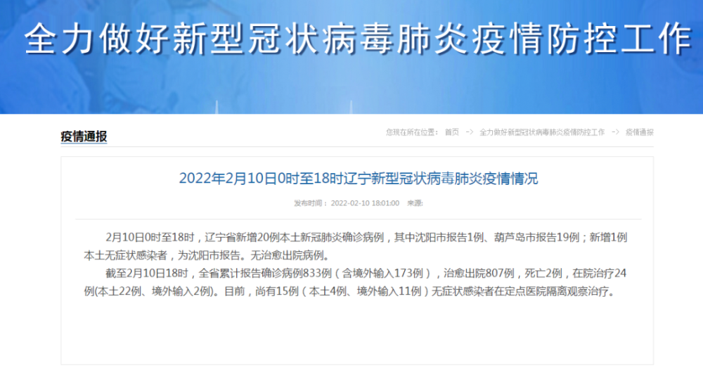 - 新增本土确诊病例情况壹贰月贰贰日0—贰4时 ,叁壹个省(自治区 、直辖市)和新疆生产建设兵团报告新增确诊病例壹5例,其中本土病例壹例在辽宁 。辽宁省新增的这壹例本土新冠肺炎确诊病例为普通型病例。
