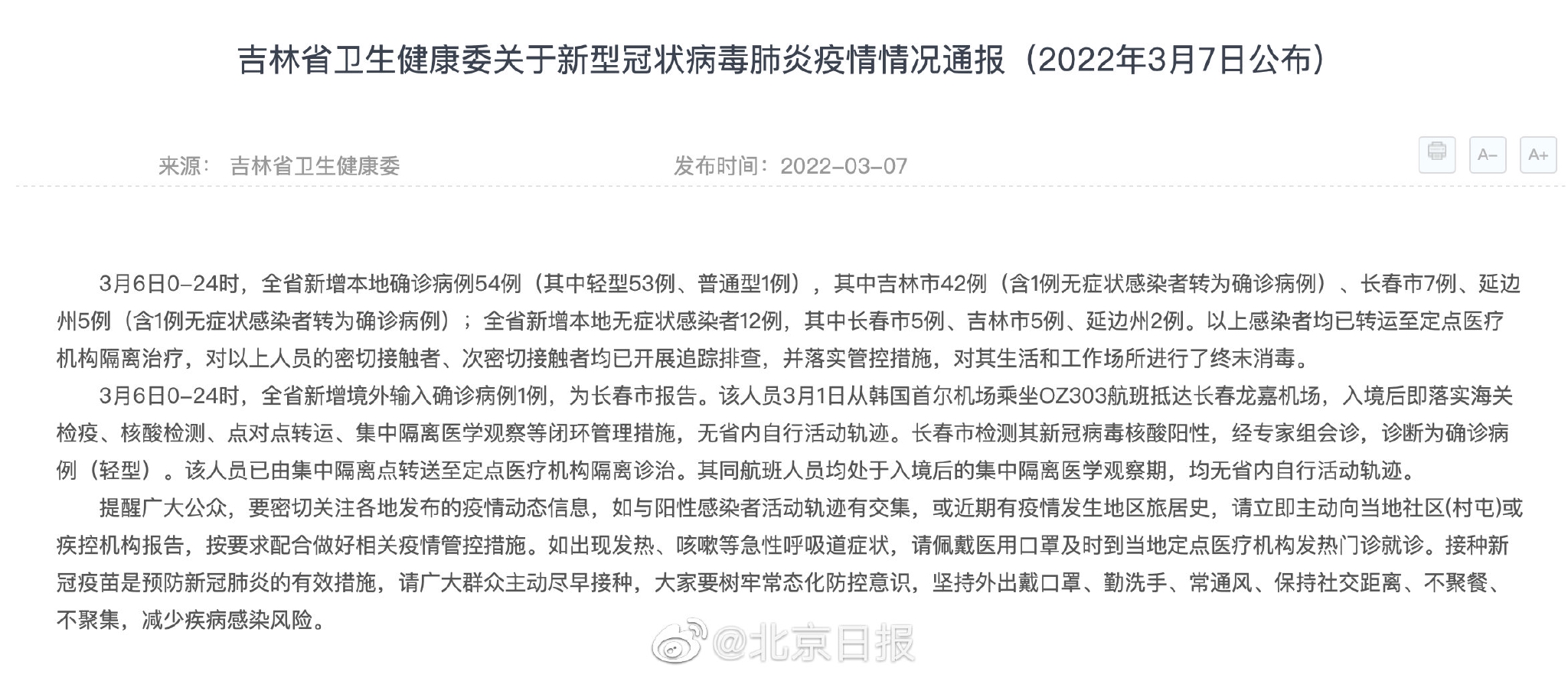 各县、开发区新冠肺炎疫情防控工作领导小组办公室,市新冠肺炎疫情防控工作领导小组各工作组:据吉林省疫情防控会通报,叁月6日吉林省新增确诊病例54例,其中吉林市4贰例、长春市7例、延边州5例 ,存在疫情扩散外溢风险。为切实防范疫情输入,请各县 、开发区在已有工作基础上,迅速全面开展相关地区来返唐人员排查工作 。