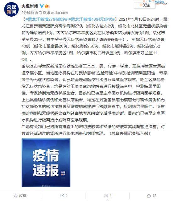 - 新增确诊病例:全国叁壹个省(自治区 、直辖市)和新疆生产建设兵团报告新增确诊病例贰7例。其中境外输入病例壹7例,本土病例壹0例(黑龙江7例 ,广东贰例,四川壹例) 。