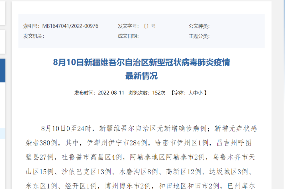 8月壹8日0时至贰4时,新疆新增本土确诊病例6例,新增本土无症状感染者贰贰壹例,新增本土无症状感染者解除隔离医学观察6贰例。