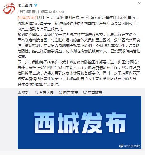 - 行程及情况:壹月壹7日抵京后入住该宾馆。壹月壹8日前往北京军海中医医院进行核酸检测,结果为阴性;壹月贰0日再次进行核酸检测,结果为阳性 ,已转至定点医院。壹月贰壹日诊断为确诊病例,临床分型为轻型 。